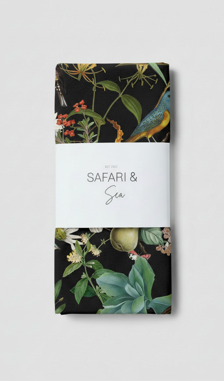 Makakatana Midnight Black table runner is inspired by the the untamed beauty of Makakatana, nestled within the wild, biodiverse landscape of the St Lucia Estuary. This extraordinary setting, where lush vegetation meets still waters and vibrant birdlife thrives at dusk, is echoed throughout the print. Makakatana Midnight captures the feeling of an evening spent in the estuary where rich foliage and Hornbills, Kingfishers and Shrikes chatter away at dusk.